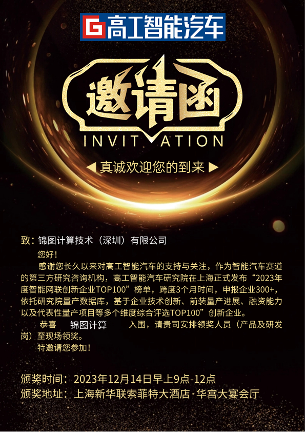 高工智能汽车研究院将于2023年12月14日在上海正式发布“2023年度智能网联创新企业TOP100”榜单。跨度3个月时间,申报企业300+,依托研究院量产数据库,基于企业技术创新、前装量产进展、融资能力以及代表性量产项目等多个维度综合评选TOP100”创新企业。锦图计算成功入围TOP100企业榜单。